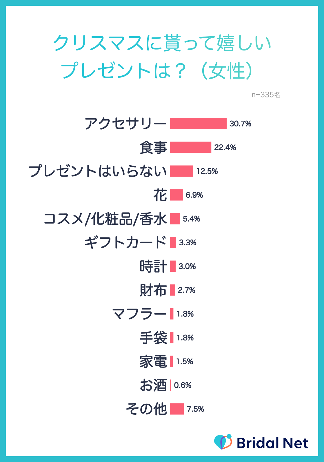 一方、女性は1位が「アクセサリー(30.7%)」、2位が「食事(22.4%)」、3位が「プレゼントはいらない(12.5%)」という結果に。お相手に気を遣わせしまうことを懸念してか、「プレゼントはいらない」や「食事」が男女ともに上位となりました。プレゼントの定番であるアクセサリーが嬉しいという方も多いことが分かりました。