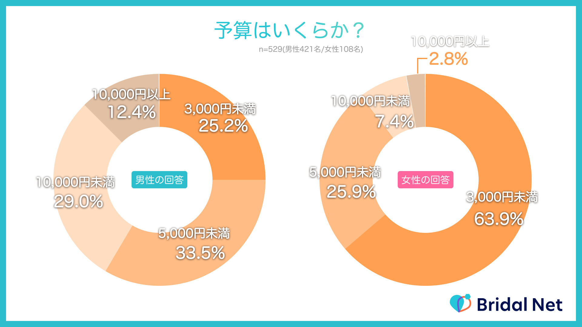 「プレゼントを渡す」と回答した方に対し、予算について質問したところ、男性は「3,000円~5,000円未満」が最も多く、女性は「3,000円未満」が6割を占める結果に。 交際に発展する前の段階では、お相手の負担にならないようお互いに気を遣っていることがわかりました。