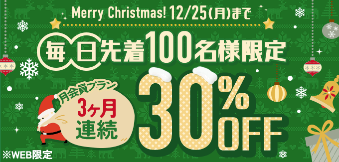 期間:2023年12月23日(土)~12月25日(月) 内容:月会員プラン定価3,980円→2,780円(30%OFF) ご登録から3ヶ月間は毎月キャンペーン価格が適用 |