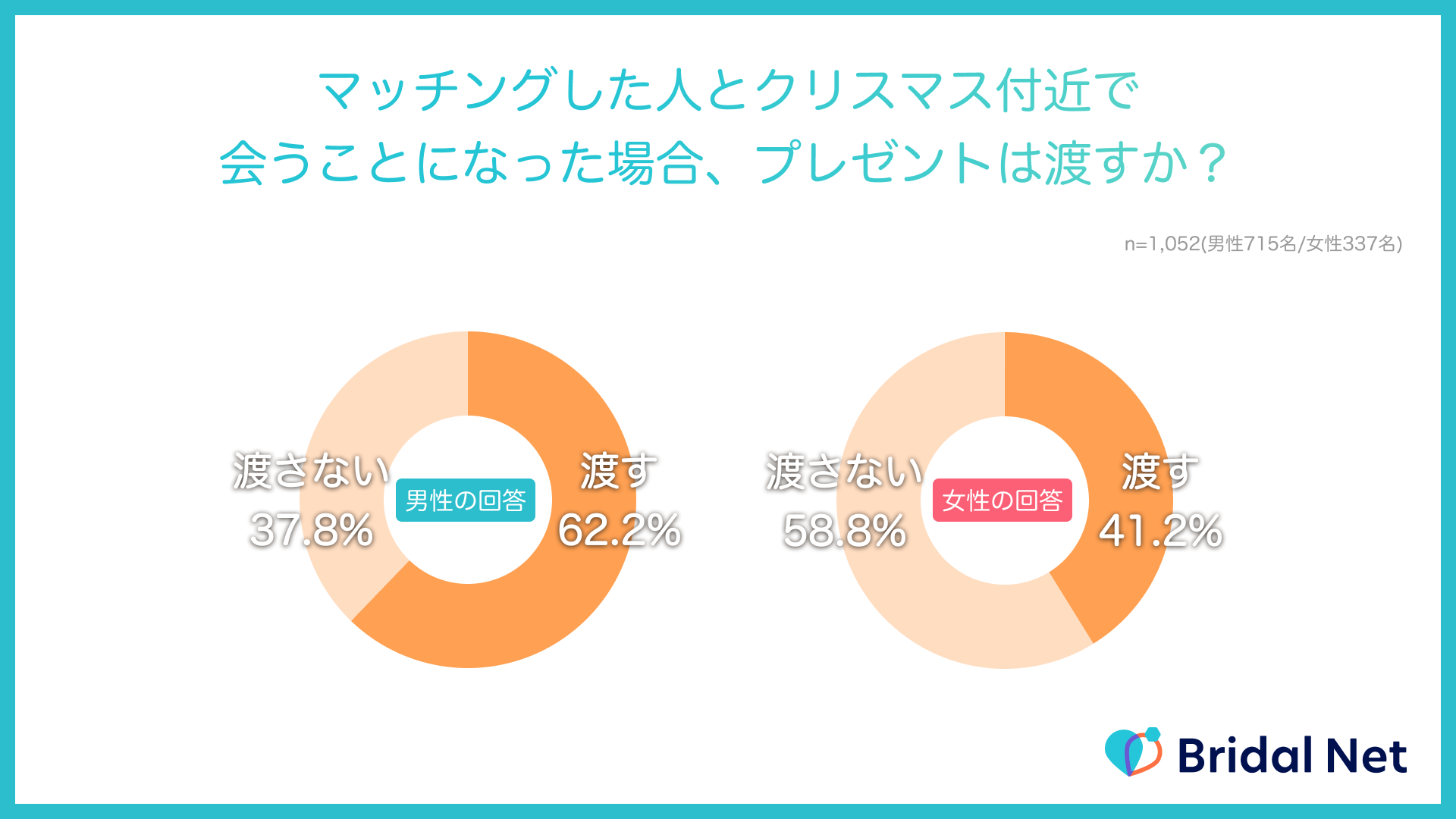 婚活アプリでマッチングした人とクリスマス付近に会う場合、プレゼントを渡すか否かについて調査しました。男性は「渡す(62.2%)」、一方女性は「渡さない(58.8%)」が多くなる結果に。渡さない派の女性の理由として、「マッチングしただけで付き合っているわけではないし、深い関係でないため」といった声が多く寄せられました。女性は関係性を重視して、お相手に負担をかけたくないと考えている方が多いようです。