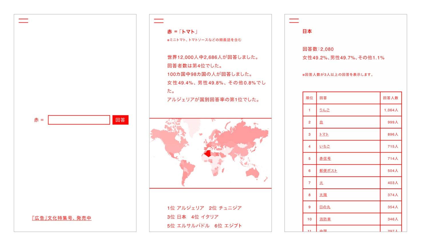 『広告』ウェブサイト上で、本調査と連動した特別企画を実施します。「赤から想起するもの」をウェブサイト内の回答欄に入力すると、本調査の回答者12,000人中何人がその単語を答えたか、100カ国中何カ国の人が答えたか、どの国の回答率が高かったかなどが表示されます。また、回答数の多い単語については、その単語と「赤」の関係の解説を用意しています。