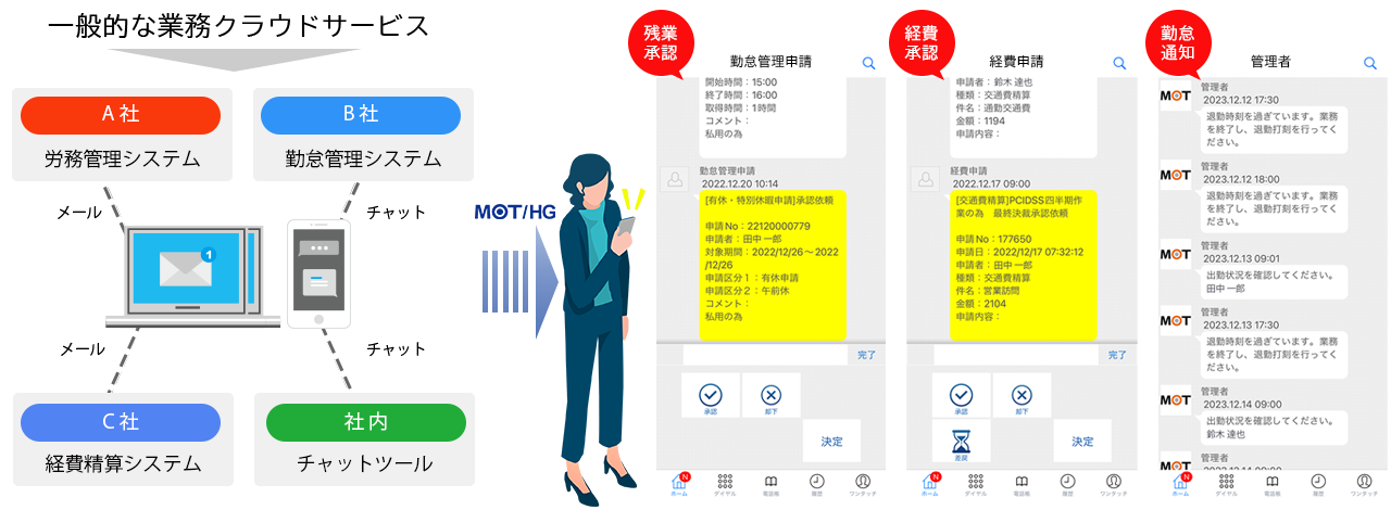 MOT勤怠管理とMOT/HGなら専用チャット+スマホ内線アプリが付属しているため、SlackやChatworkなどのツールと連携なしでチャットで勤怠や経費申請の通知、承認を受けることができます。