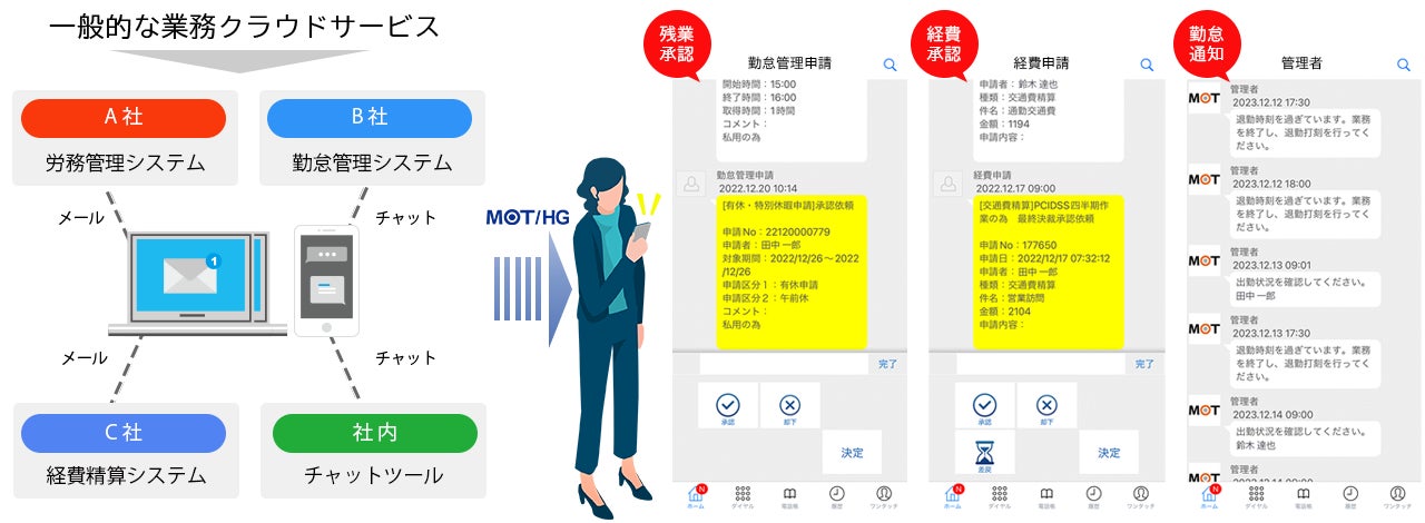 高機能シフト管理が標準で付属、クラウド電話アプリ「MOT/Phone」と連携することでチャットで申請を確認、決裁などができるようになります。