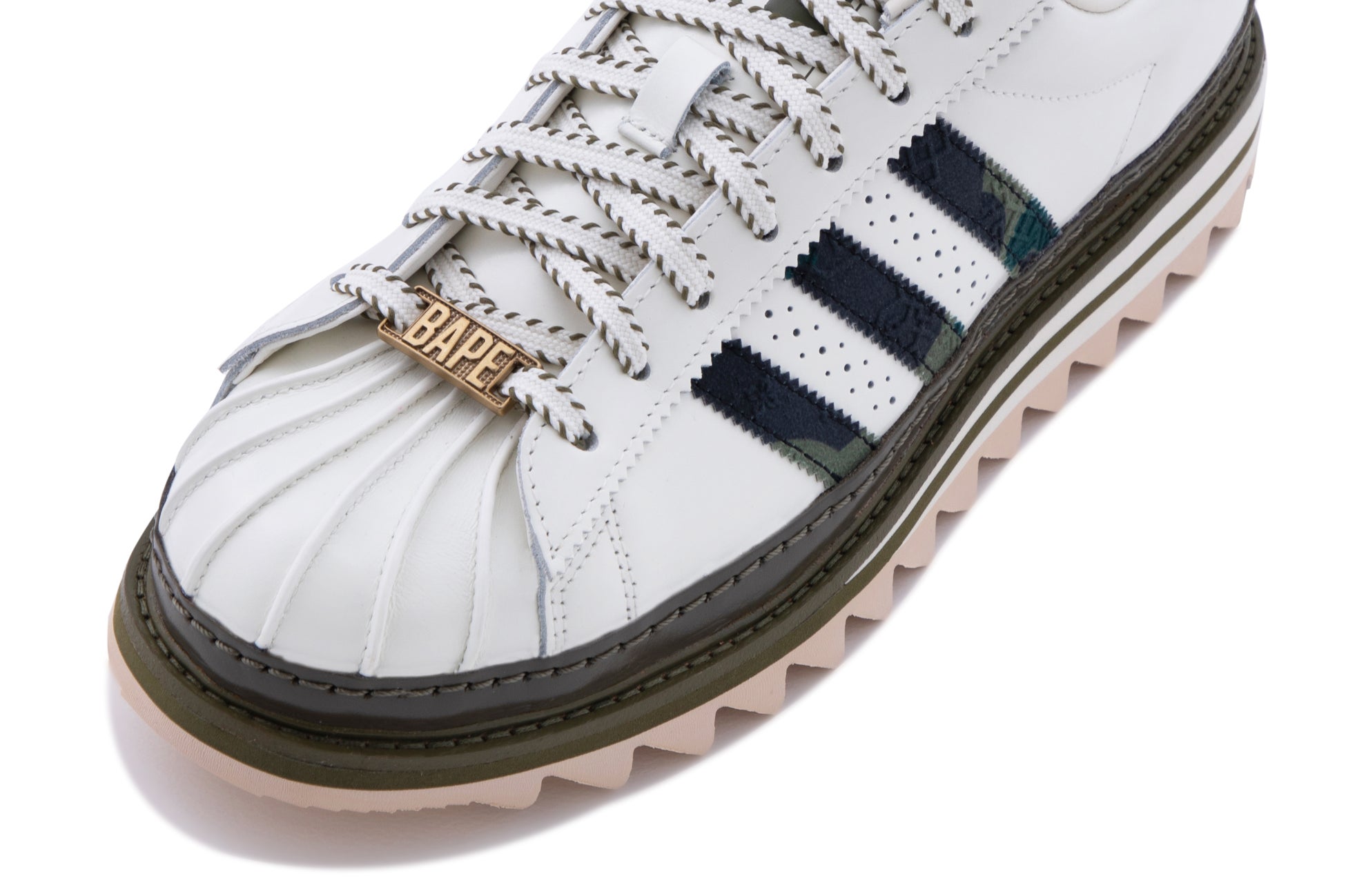 さらに、3ストライプス、STAロゴ、ヒールマスタッシュには、BAPE® のファーストカモと CLOT シルクパターンを融合した特別なグラフィックを採用。サンドカラーのリップルソールとソートゥースツールが、スーパースターのシルエットにまったく新しい表情を与えています。