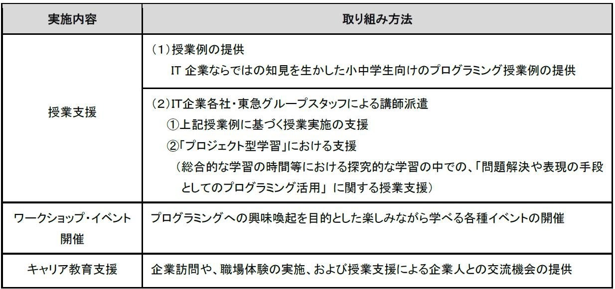 1.渋谷区立小中学校全26校に対し、プログラミング授業例の提供、およびIT企業や東急グループのスタッフによる講師・サポート役としての授業支援を実施