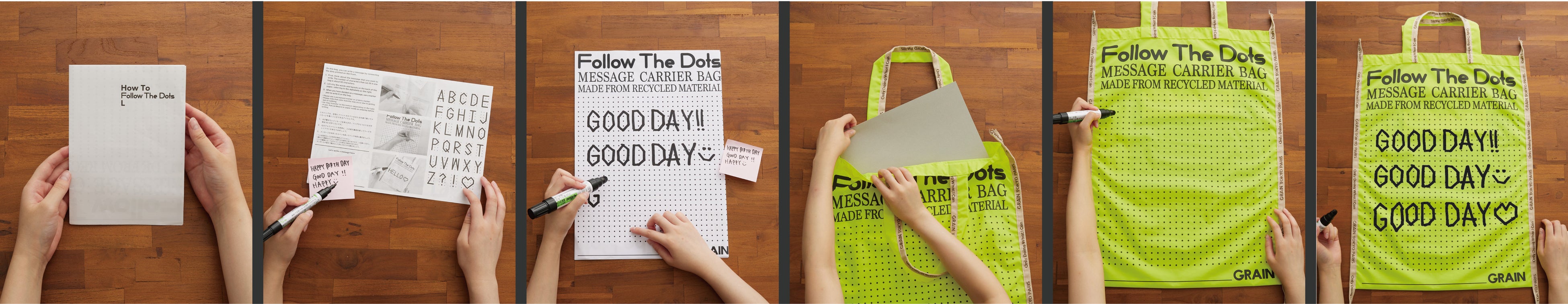バッグ本体にプリントされた点と点をつないで、メッセージを書くことができるアイテムです。
