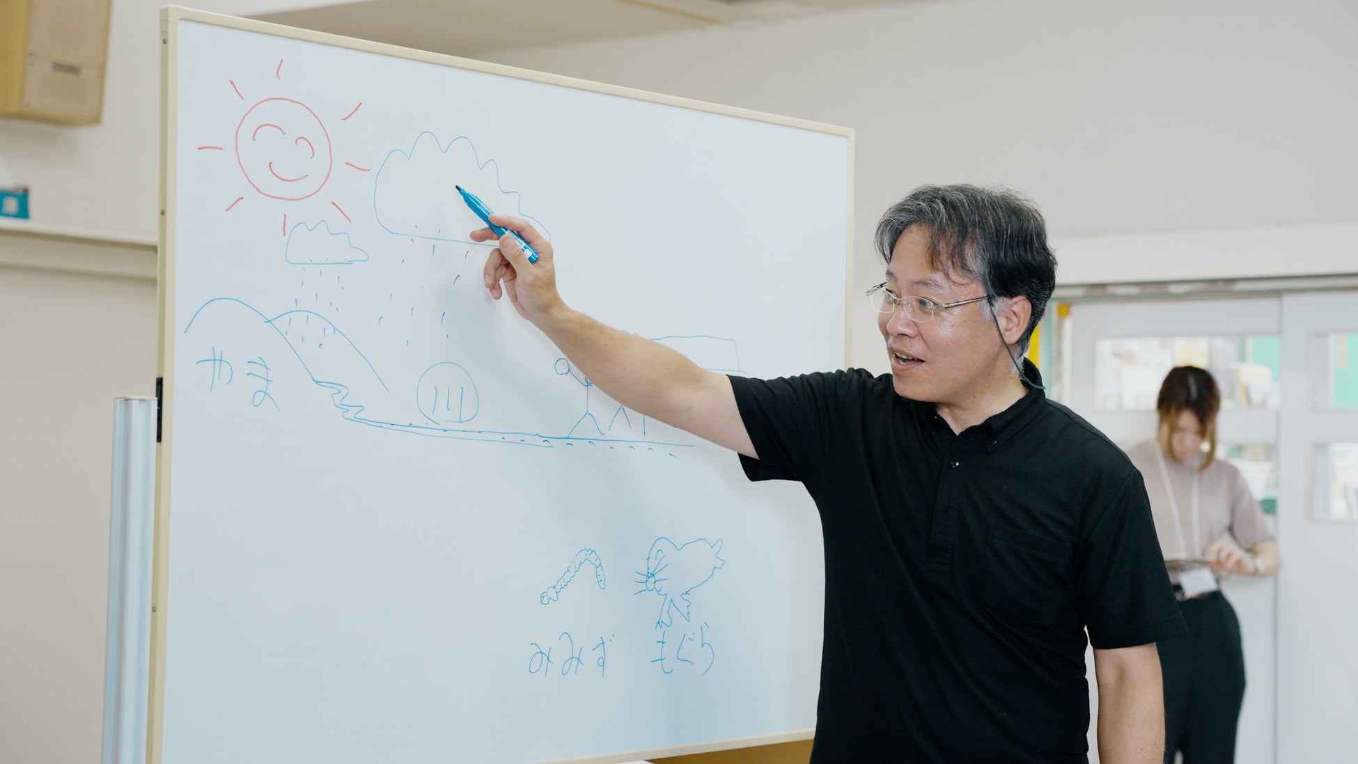続いて松本先生から、泥が自分たちの生活と密接な関係であると知ってもらうことを目的として、“山や川を伝って浸食、運搬されて運ばれてきた泥”や“土を元気にするミミズやモグラといった生き物の存在”など、泥にまつわる物語を語っていただきました。松本先生は「子どもたちが泥のできる仕組み、物語を今知っておくことで将来の学校での学びにもつながる」と話します。