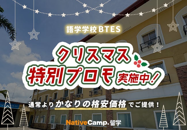 ネイティブスピーカーと回数無制限のオンライン英会話サービス「ネイティブキャンプ英会話」を展開する株式会社ネイティブキャンプ(東京都渋谷区 代表取締役: 谷川国洋)は、海外留学エージェントサービス「ネイティブキャンプ留学」において、フィリピン・セブ島の語学学校「BTES」にてクリスマス特別プロモを実施いたします。