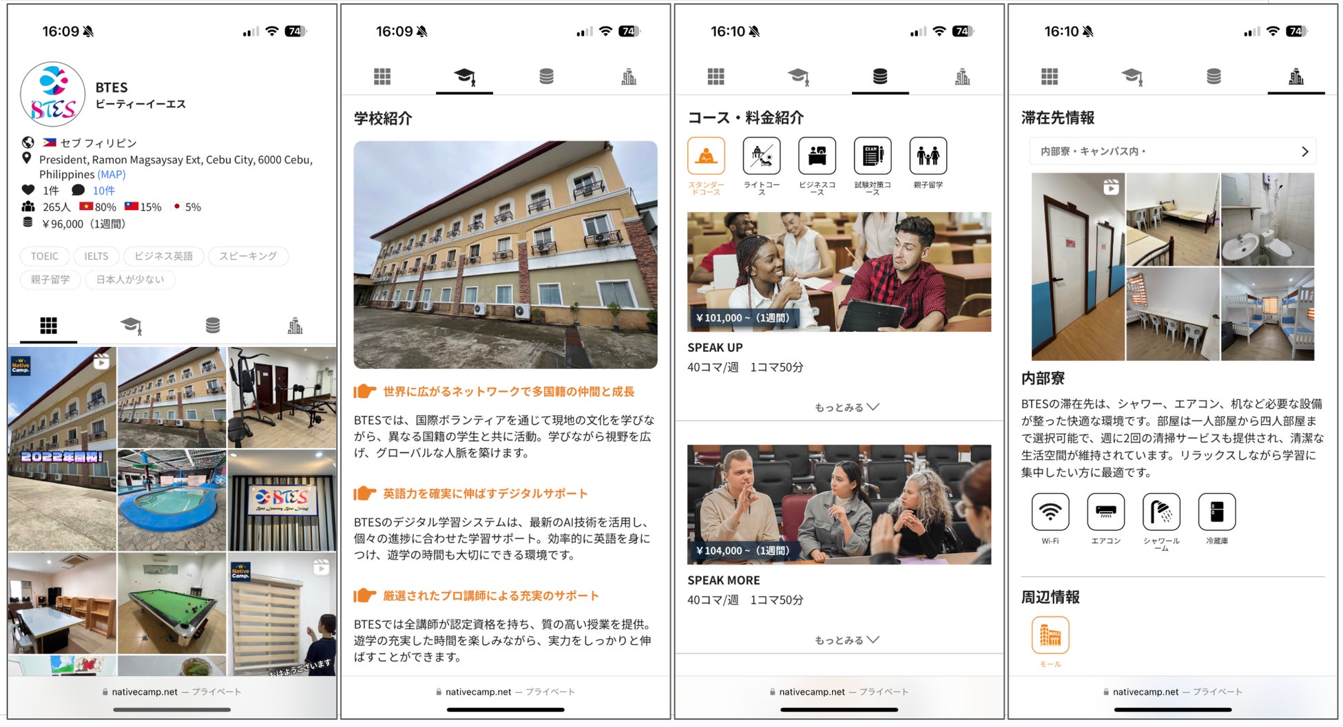 ネイティブキャンプ留学では、ユーザーが必要な情報を分かりやすく把握できるよう、常に丁寧で明確な情報提供を心がけています。BTESの詳細情報は、以下の4つのカテゴリーに分けて掲載しており、知りたい情報を的確にお届けします。