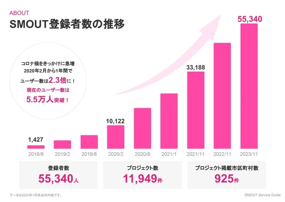 SMOUTは、地域の人と地域に関わりたい人をつなぐ、デジタルプラットフォームです。2018年6月のサービス開始以来、925市区町村、約5万5千人の一般ユーザーに増加しました(2023年12月時点)。