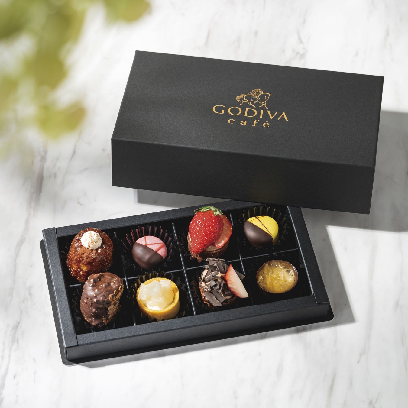 ご自宅でアフタヌーンティーをお楽しみいただけるよう、ゴディバカフェオリジナルのプチガトーを揃えました。高級感のある化粧箱で提供します。