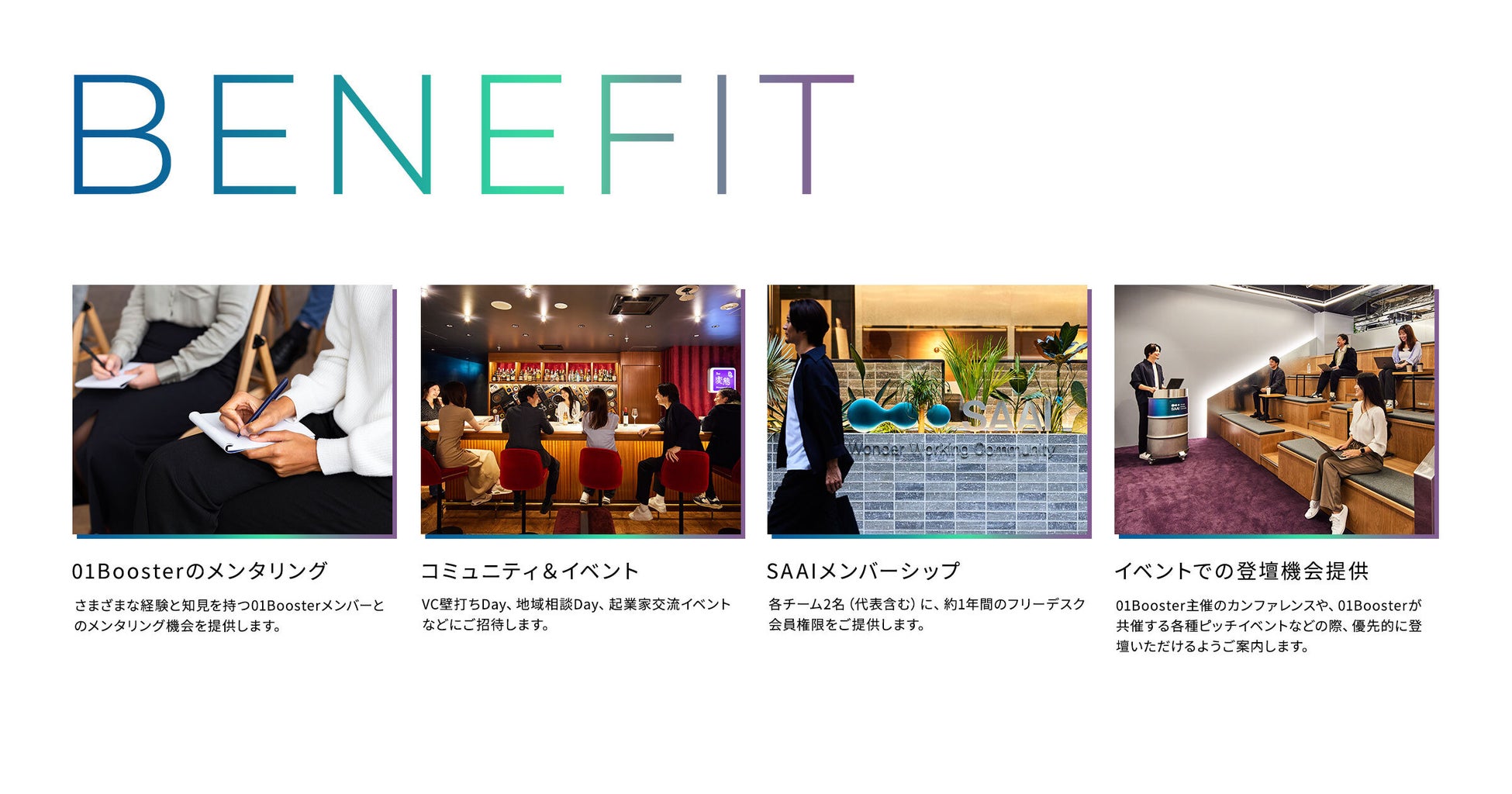 採択者には、01Boosterによるメンタリングや「SAAI」の約1年間無償利用、さらに大手企業やコミュニティとの連携機会が提供されます。