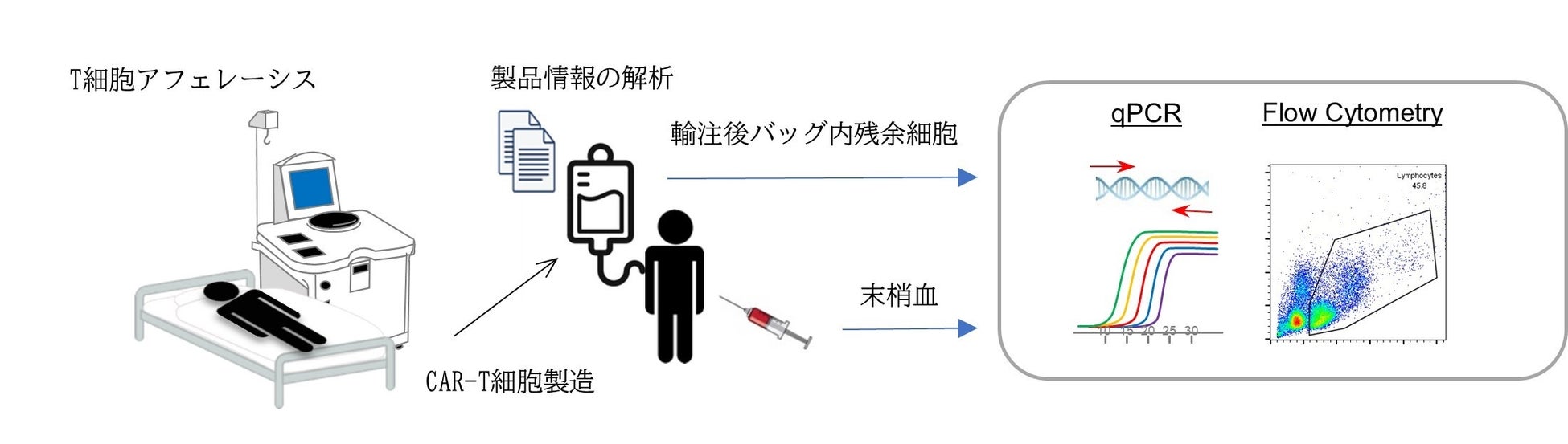 アフェレーシスT細胞から製造されたCAR-T細胞について、最終品質報告書による製品情報の解析のほか、輸注後バッグ内残余細胞や患者末梢血の検体をqPCR法およびフローサイトメトリーを用いて解析した。