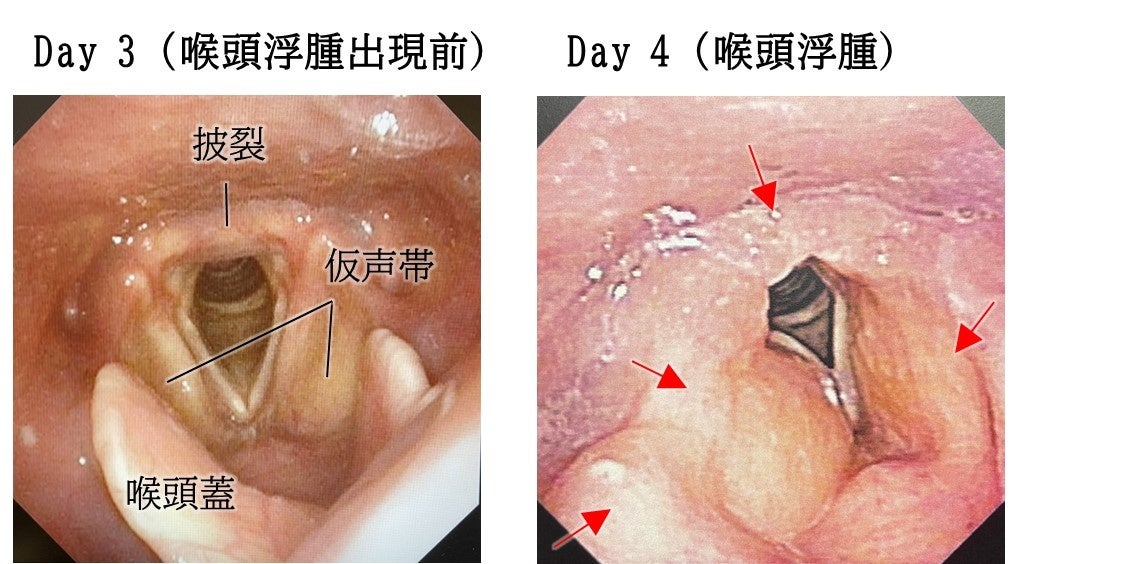上記の発症リスクを考慮して喉頭浮腫を早期発見することで、迅速で適切な処置と治療に繋げることが、極めて重要であると結論づけた。