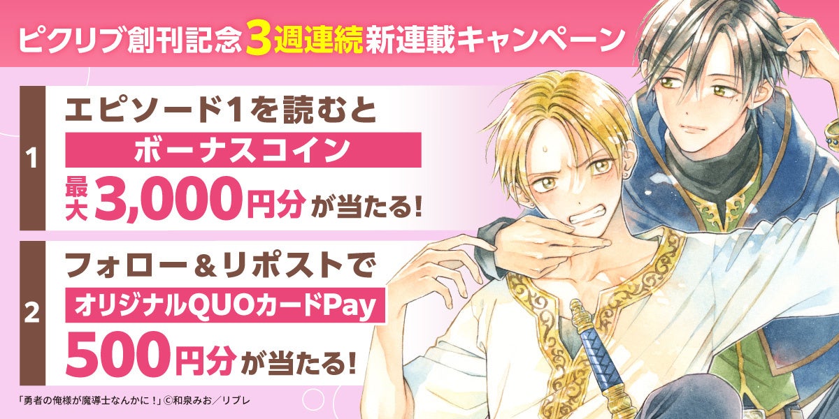 さらに、連載作品3作品すべてのエピソード1を読了した読者様から、抽選で5名様に3,000円分のボーナスコインをプレゼント!