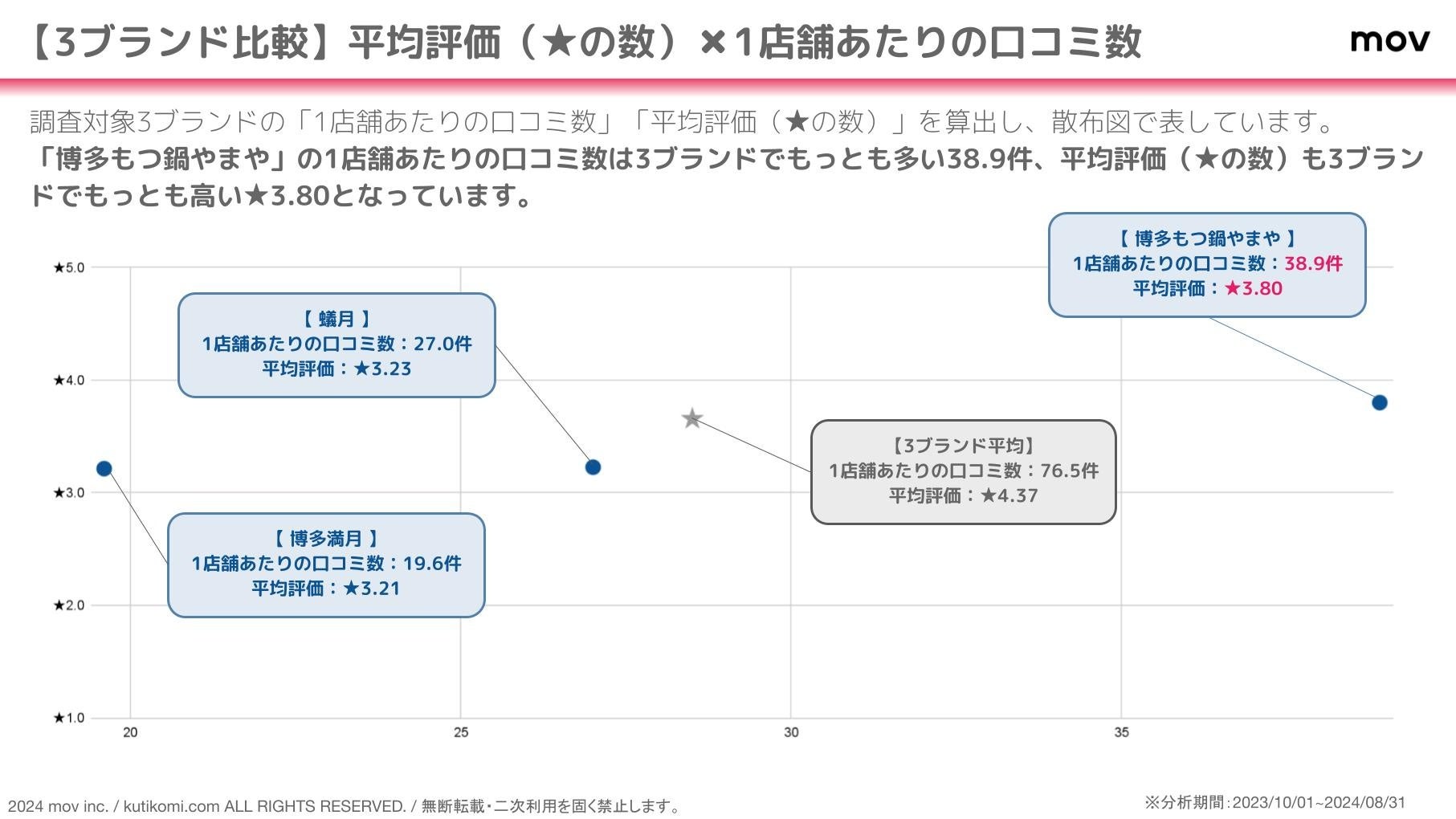 こちらの散布図では、調査対象3ブランドの「1店舗あたりの口コミ数」「平均評価(★の数)」を算出しています。「博多もつ鍋やまや」の1店舗あたりの口コミ数は3ブランドでもっとも多い38.9件、平均評価(★の数)も3ブランドでもっとも高い★3.80となっています。