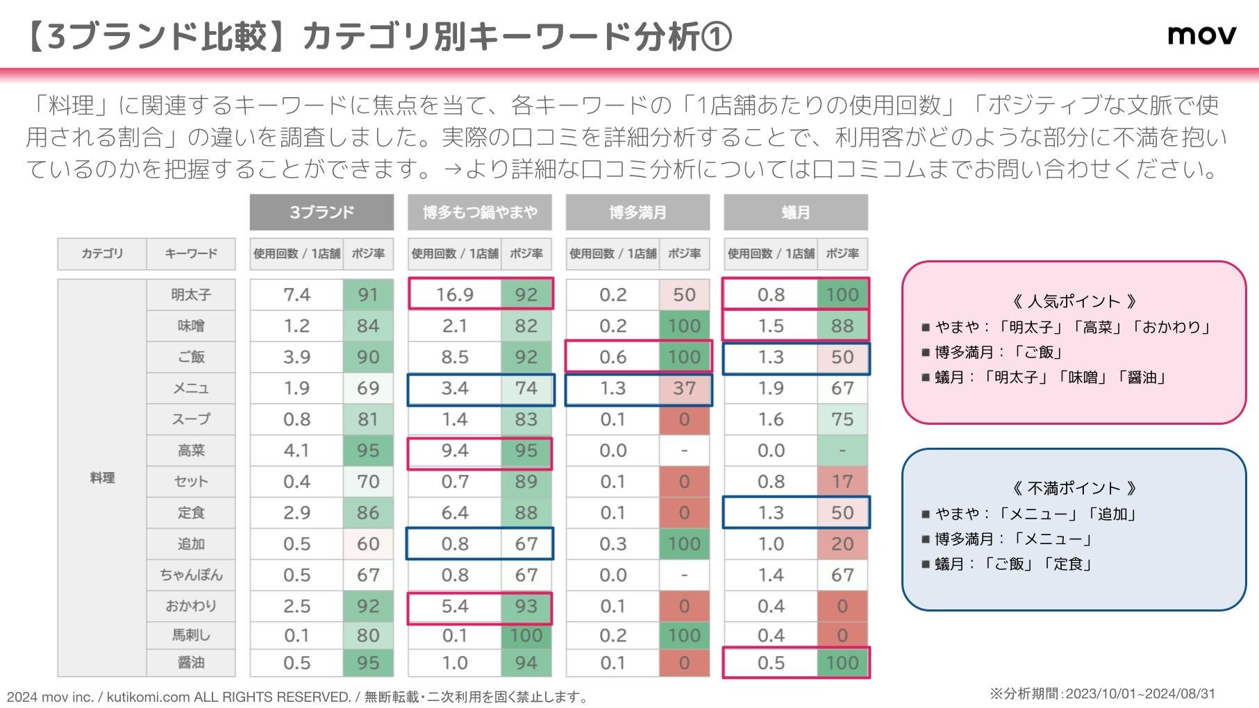 こちらの表では、「料理」に関連するキーワードに焦点を当て、各キーワードの「1店舗あたりの使用回数」「ポジティブな文脈で使用される割合」の違いを調査しています。実際の口コミを詳細分析することで、利用客がどのような部分に不満を抱いているのかを把握することができます。より詳細な口コミ分析については口コミコムまでお問い合わせください。