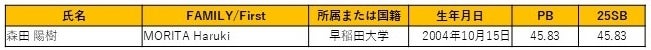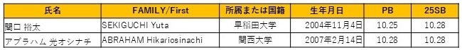 「関東学生対抗選手権」男子100mで、すでに出場予定の栁田大輝(東洋大学)に次ぐ10秒02(+4.5m)で2位となった関口裕太(早稲田大学)が登場。関口は、2023年U20アジア選手権で日本代表の経験もあり、注目が集まります。また、「関西学生対校選手権」男子100m優勝のアブラハム光オシナチ(関西大学)、GPシリーズ出雲大会「吉岡隆徳記念出雲陸上」男子300mを制した森田陽樹(早稲田大学)らが世界に挑戦します。