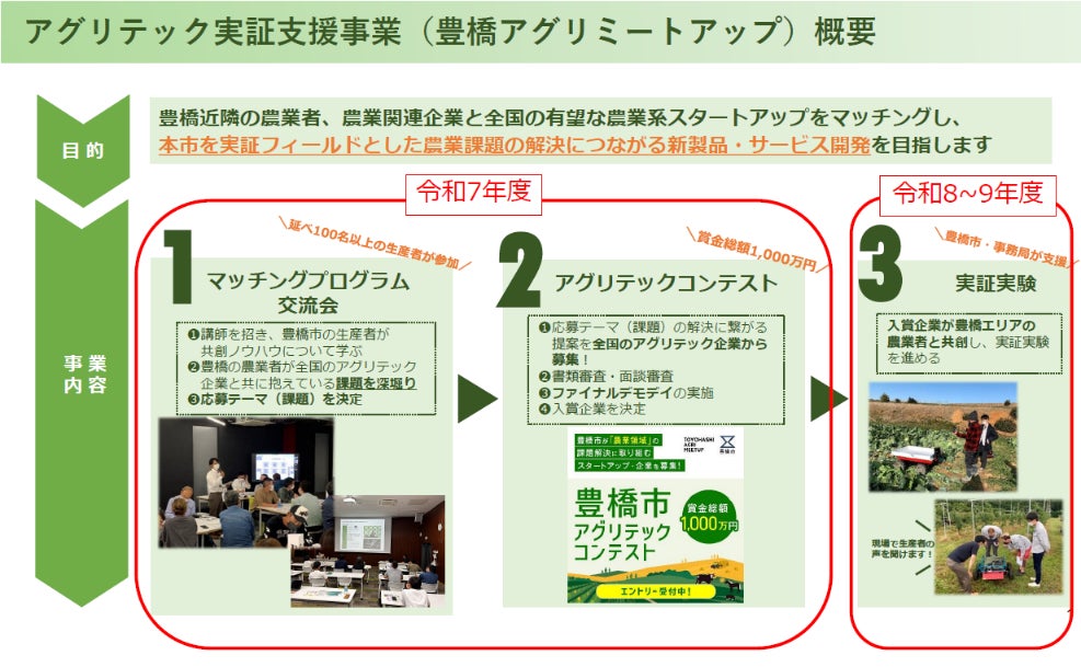 豊橋市の農業者等が抱える課題の解決に資する製品・サービスの社会実装を目指し、市内外のスタートアップと本市農業者等が協働で実証開発に取り組む共創プロジェクトを組成するため、以下の取組みを実施します。