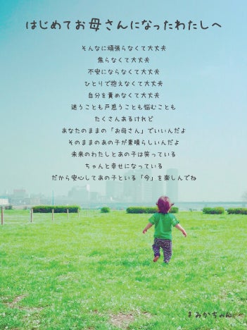 著者の#みかちゃんは「寄り添う気持ちで、初めてお母さんになった私がほしかった言葉たちを綴りました。戸惑いながらも一生懸命なお母さん方へ届きますように。そして、かけがえのない命とともに、家族で楽しく笑ってすごせる時間が増えますように。」とコメントをよせた。想いを語った動画はこちら↓
