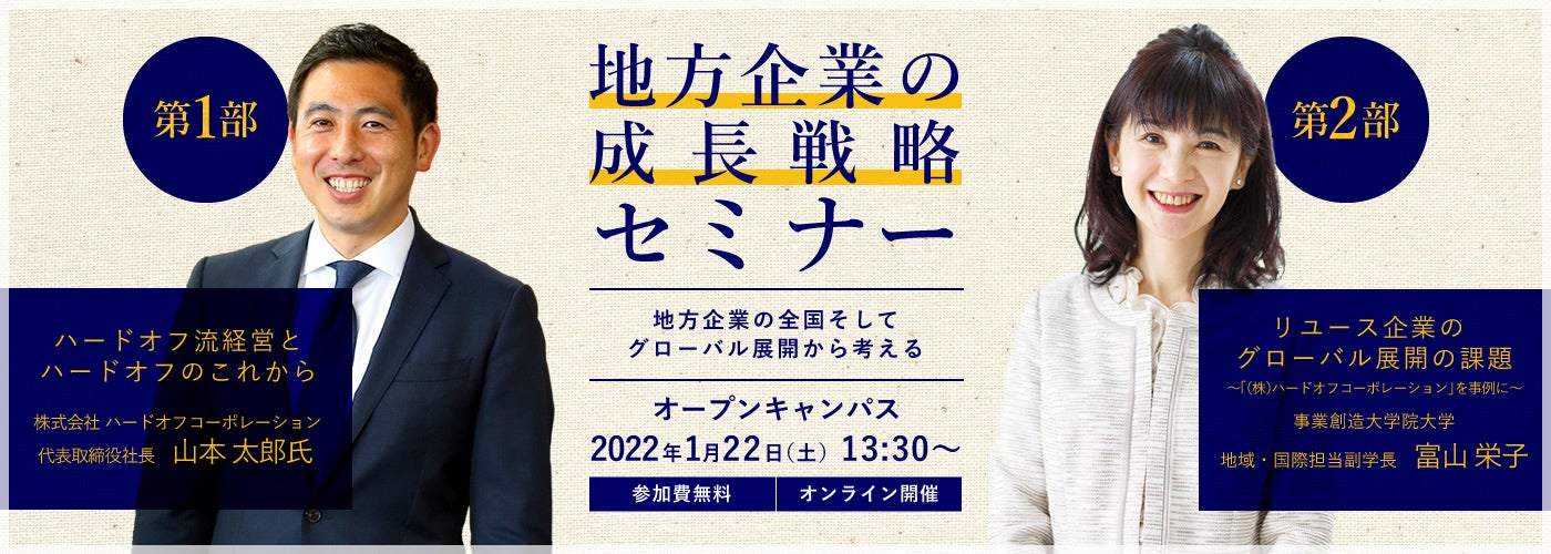 【事業創造大学院大学】1/22(土)13:30~(株)ハードオフコーポレーション山本太郎代表取締役社長×富山副学長による地方企業の成長戦略セミナーを開催致します。【オンライン開催・参加費無料】