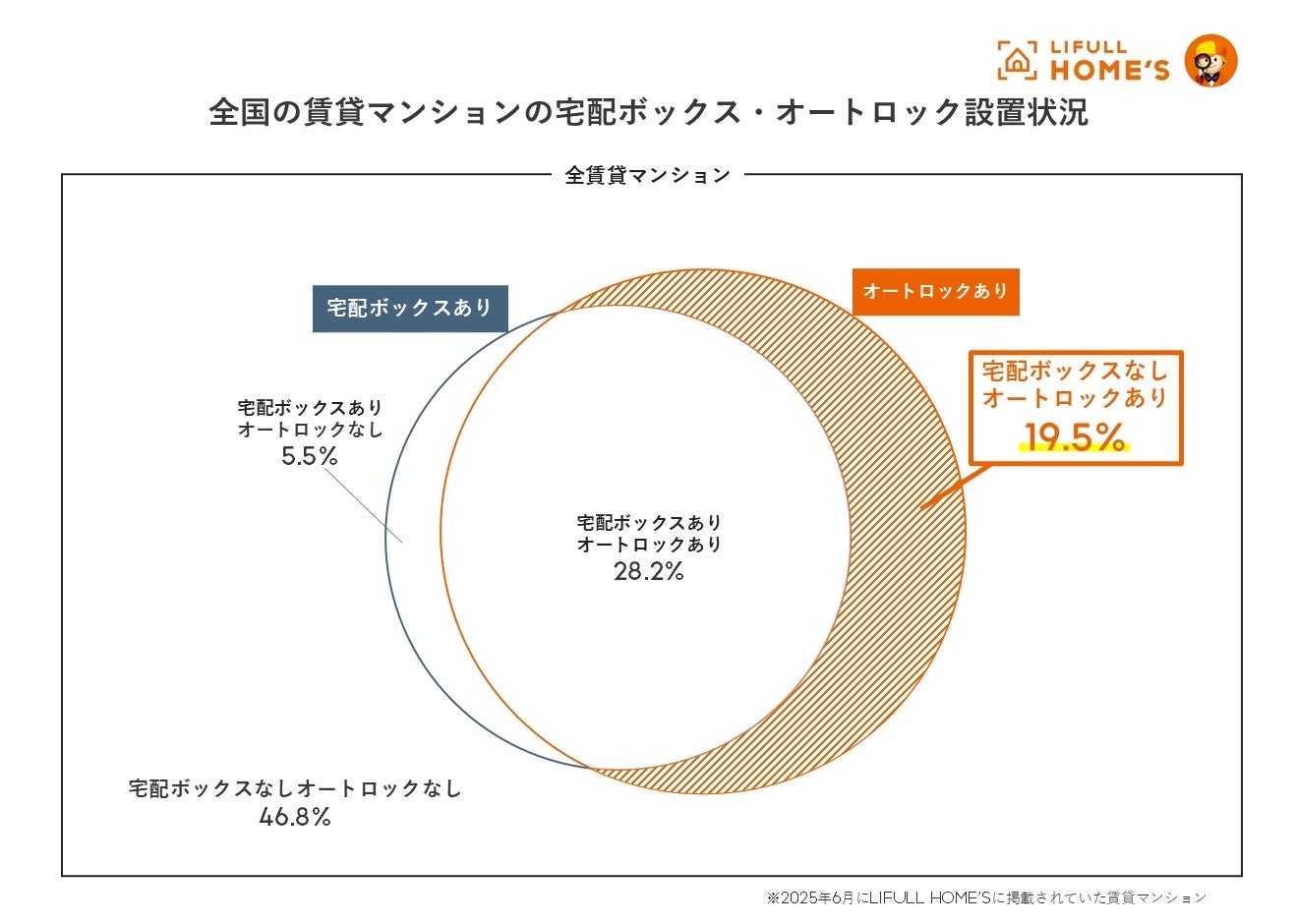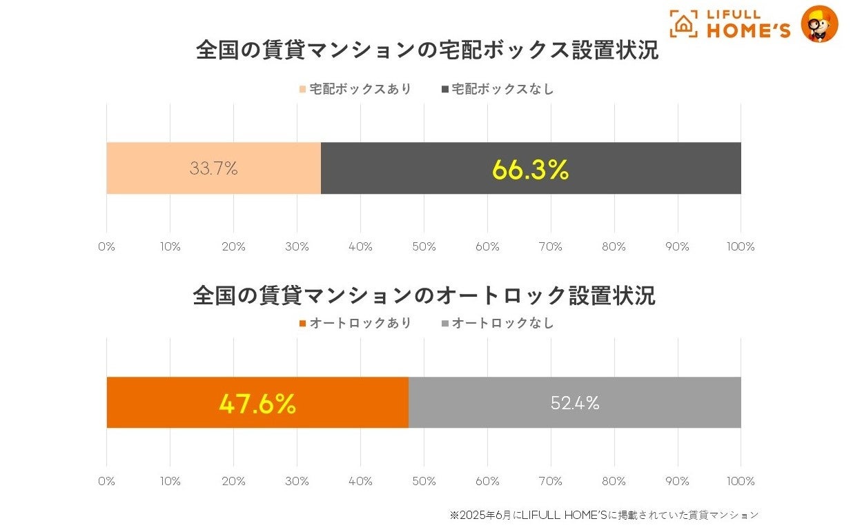 そこで、直近2025年6月にLIFULL HOME'Sに掲載されていた、賃貸マンションにおける宅配ボックスとオートロックの設置状況を調査しました。