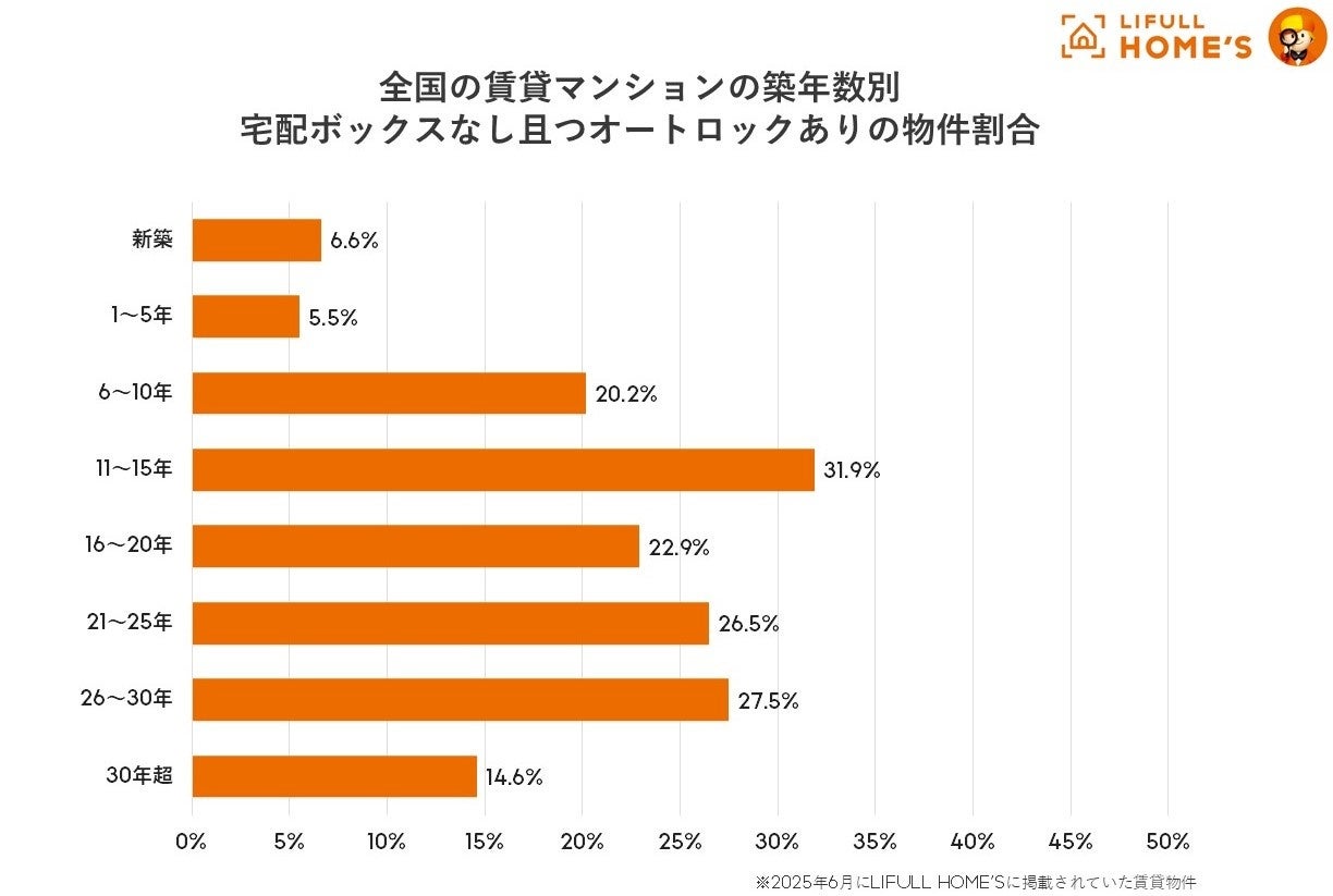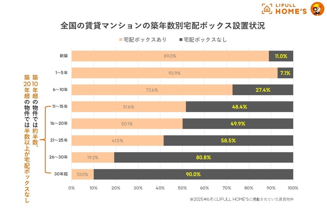 築10年超の物件では約半数、築30年超の物件では9割が宅配ボックスなし