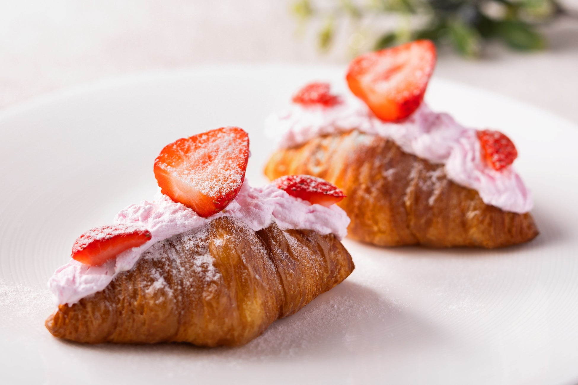 ライブキッチンで焼き上げるクロワッサンにスタッフがお客様の目の前でフレッシュなあまおうとホイップクリームをたっぷりと絞り提供します。