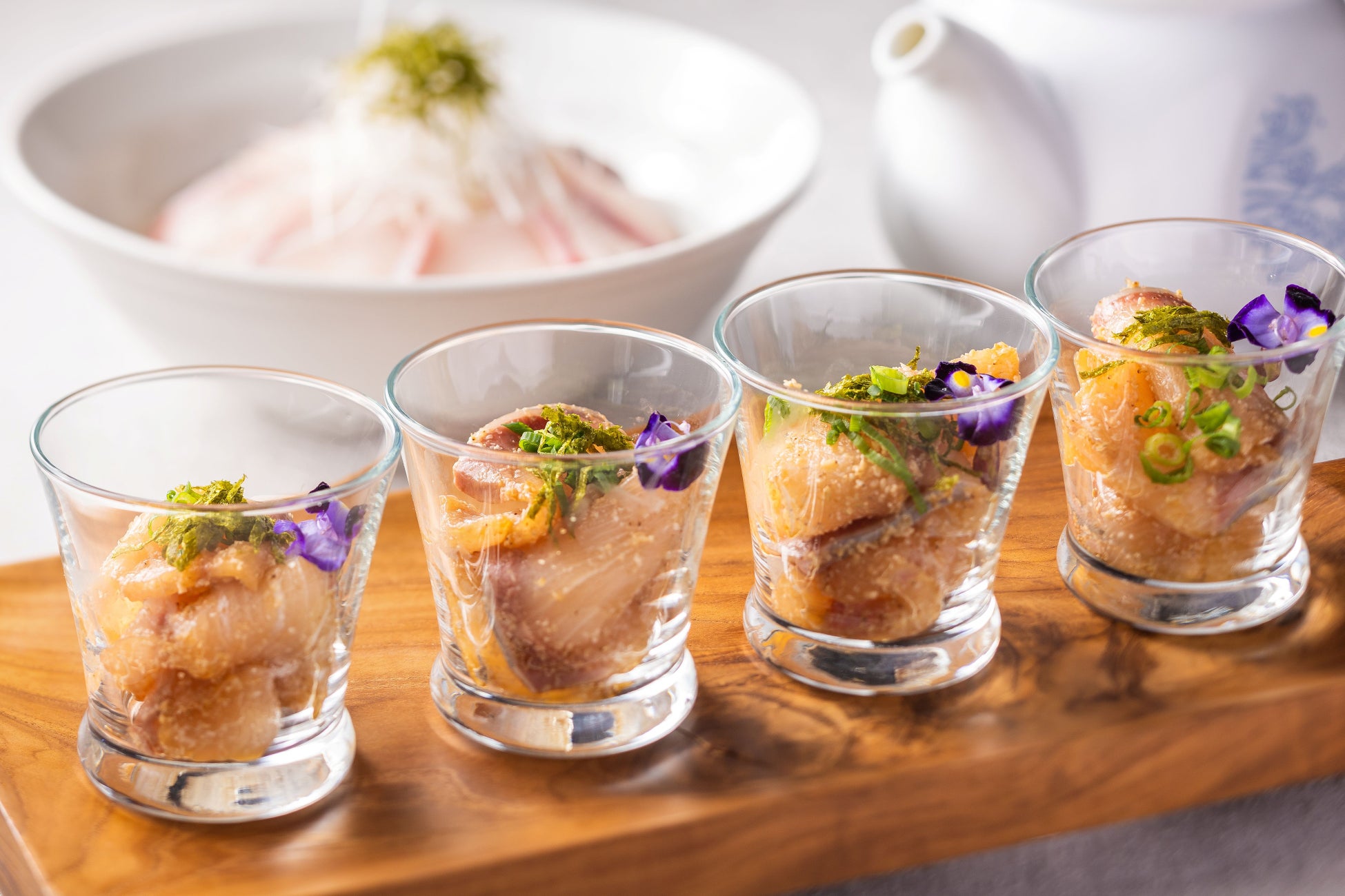 期間中はいちごだけでなく、良質な魚介類が水揚げされることでも有名な鐘崎漁港を要する宗像市主催の「むなかた地魚茶漬け祭り」に出品した「寒ぶり茶漬け」も楽しめます。1膳目は丼で、2膳目は特製の出汁をかけてお茶漬けで、寒ぶりの美味しさを余すところなく楽しめる逸品です。
