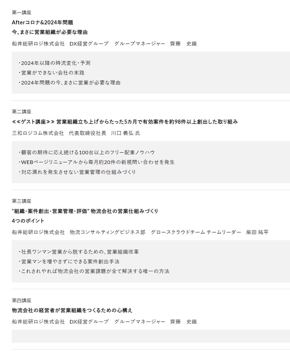 営業組織を立ち上げて業績を伸ばしているゲスト企業が登壇し、「たった5カ月で98件の新規荷主問い合わせ」を獲得した営業組織作りのノウハウについて解説していただきます。