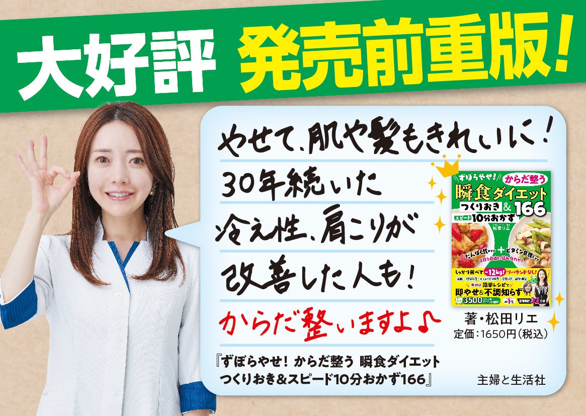 異例の【発売前重版決定!】3食おいしく食べてー12kg! “食べ痩せ評論家”としてTVで話題の “松田リエ” 著者最多レシピ数166品を収録した永久保存版!
