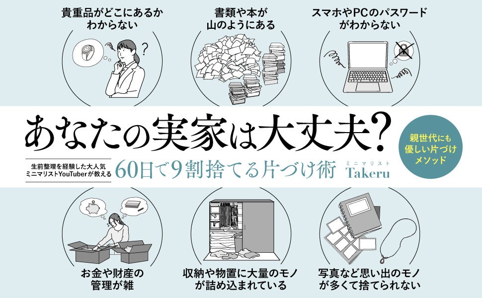 ビジネス書や実用書を中心に出版する株式会社クロスメディア・パブリッシング(本社:東京都渋谷区、代表取締役社長:小早川幸一郎)は、2024年12月20日に書籍『60日で9割捨てる片づけ術』を発売しました。著者は、大人気ミニマリストYouTuberのTakeru氏。本書では、祖母と叔父の生前整理を経験した実体験をもとに、「無理なく60日で実家の片づけをする」ための実践的なノウハウを紹介します。モノに縛られず、人生を楽しむために、まずは不要なモノを手放す一歩を踏み出してみませんか?
