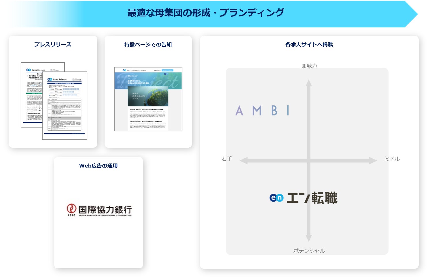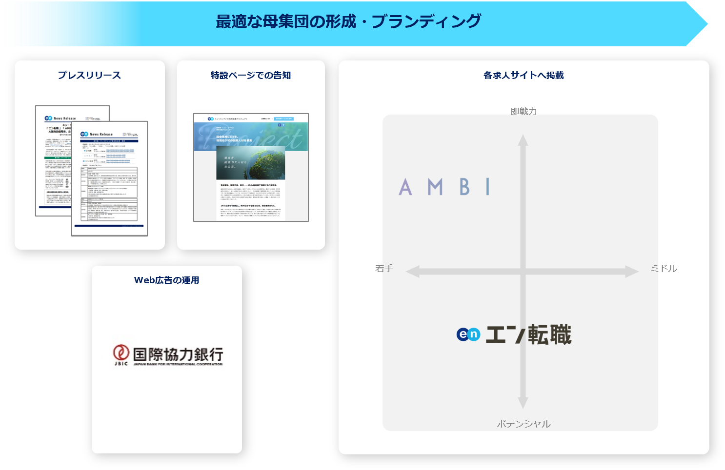プレスリリースや特設ページ、Web広告での告知に加え、各求人サイトでの集客支援を実施。『エン転職』『AMBI』とターゲットの異なる求人サイトを活用することで、ターゲットへ網羅的に求人を届けます。