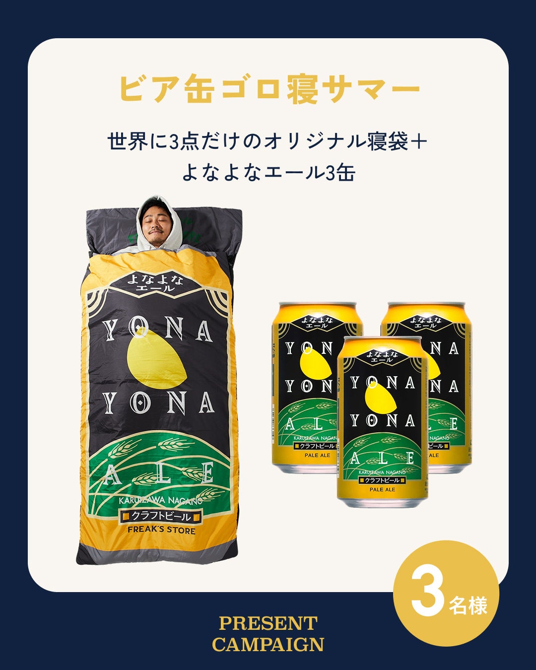 Instagramフォロー&乾杯したい場所と相手をコメントし、よなよなエールビール缶デザインの寝袋やBEB5 軽井沢 by 星野リゾート宿泊チケットが10名さまに当たるスペシャルなキャンペーンを実施。