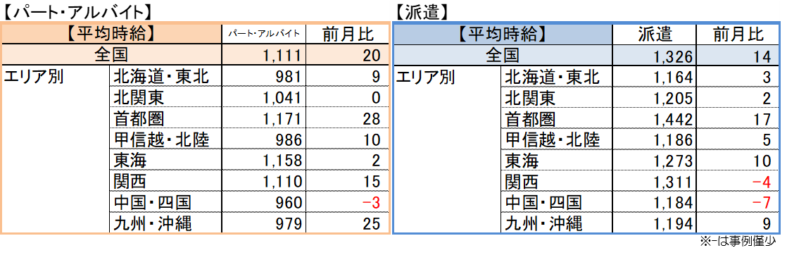 | 【パート・アルバイト】全国・全職種平均時給は1,111円。前月比+20円。前年同月比+33円。 【派遣】全国・全職種平均時給は1,326円。前月比+14円。前年同月比-13円。 【傾向】パート・アルバイトの平均時給は増加したものの、個別案件の影響を受けており、傾向としては先月から横ばい。派遣の平均時給は、全国平均より時給相場の高い保育士の求人が首都圏で掲載されたこと等を背景に増加したが、傾向としては6月以降、横ばいの状態が続いている。 |