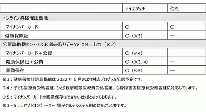 ※2:健康保険証によるオンライン資格確認支援機能は、オンライン資格確認に必要な項目を健康保険証の券面からOCR機能で読み取ります。その結果をもとにレセプト/電子カルテなどのシステムからオンライン資格確認を行う機能の対応が必要となります。