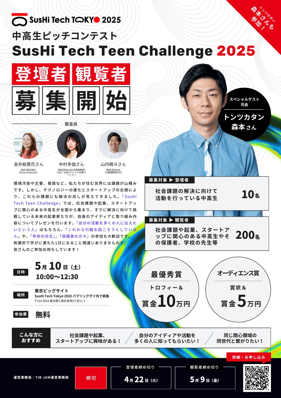 登壇者の皆さんにとって今回のこのイベントは自身の取り組みを多くの人に発信し、起業家や投資家から直接フィードバックを受ける絶好のチャンスとなります。また、観覧者の皆さんも社会課題や起業、スタートアップについての最新情報を学んだり、全国から集まる同じ志を持つ仲間たちと出会ったりすることができます。SusHi Tech Tokyo本体では最新技術やグローバルに活躍するスタートアップの魅力に触れることもできますので、ぜひ多くの中高生とそのご関係者の皆さんにお越しいただけると嬉しいです!