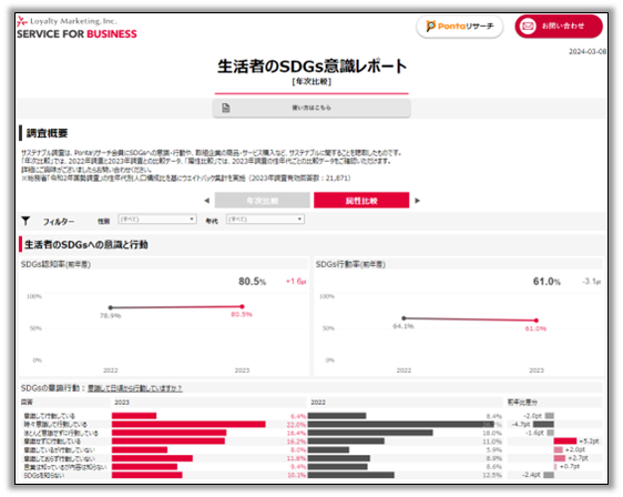 本調査結果はデータをビジュアライズして共有するプラットフォーム「Tableau Public」で無料公開します。SDGsの認知率や行動率、SDGsに取り組む企業の商品購入意向、企業の取り組みに期待するSDGsの17の目標などについて、前年データとの年次比較や性年代の比較をご覧いただけます。