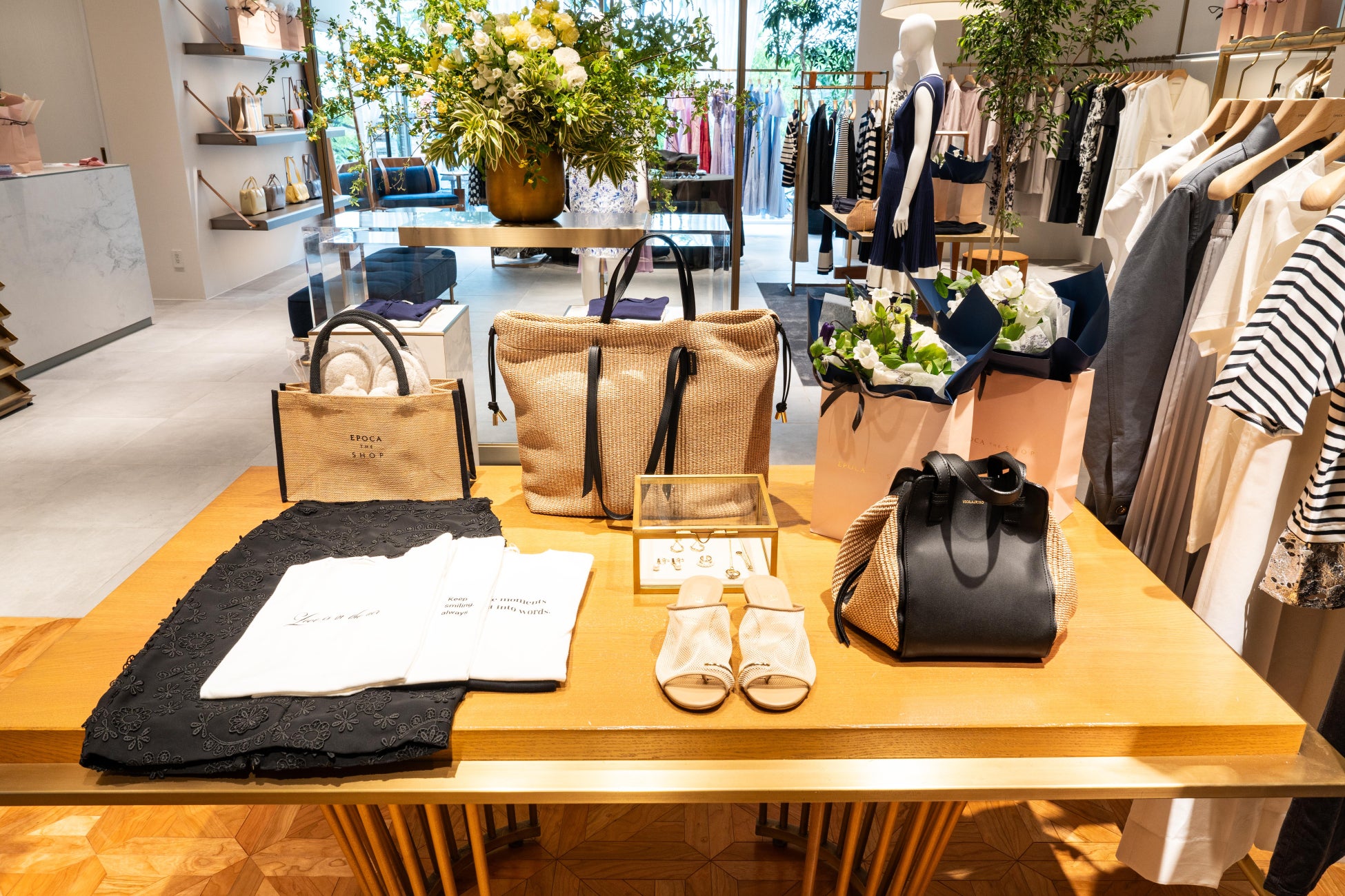 モダンでエレガントな空間の中で、エポカを中心に買付品やショップ限定アイテムとのコーディネートをお楽しみいただけます。