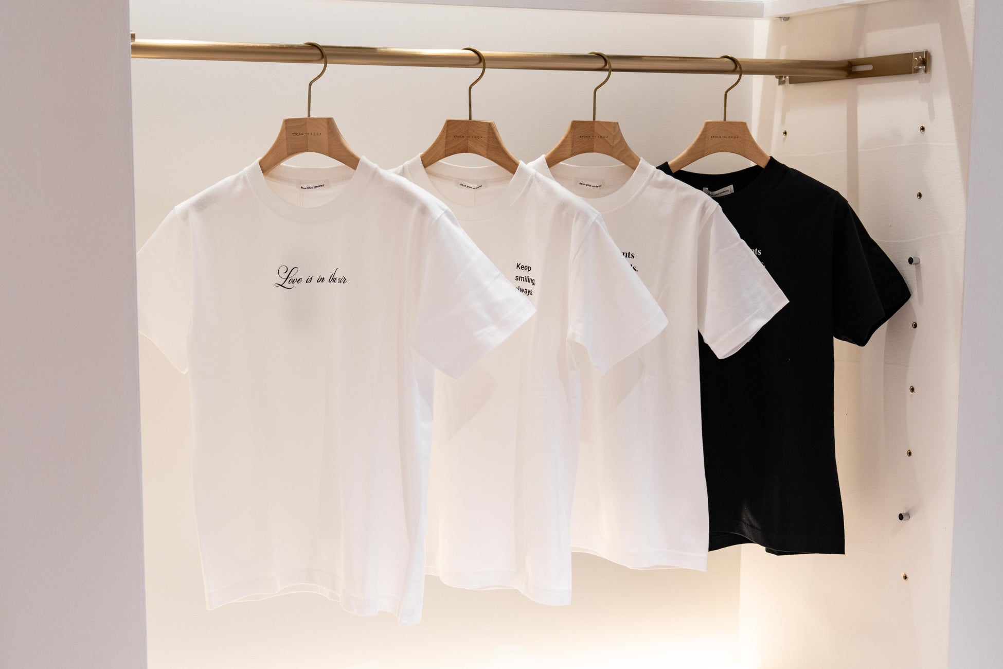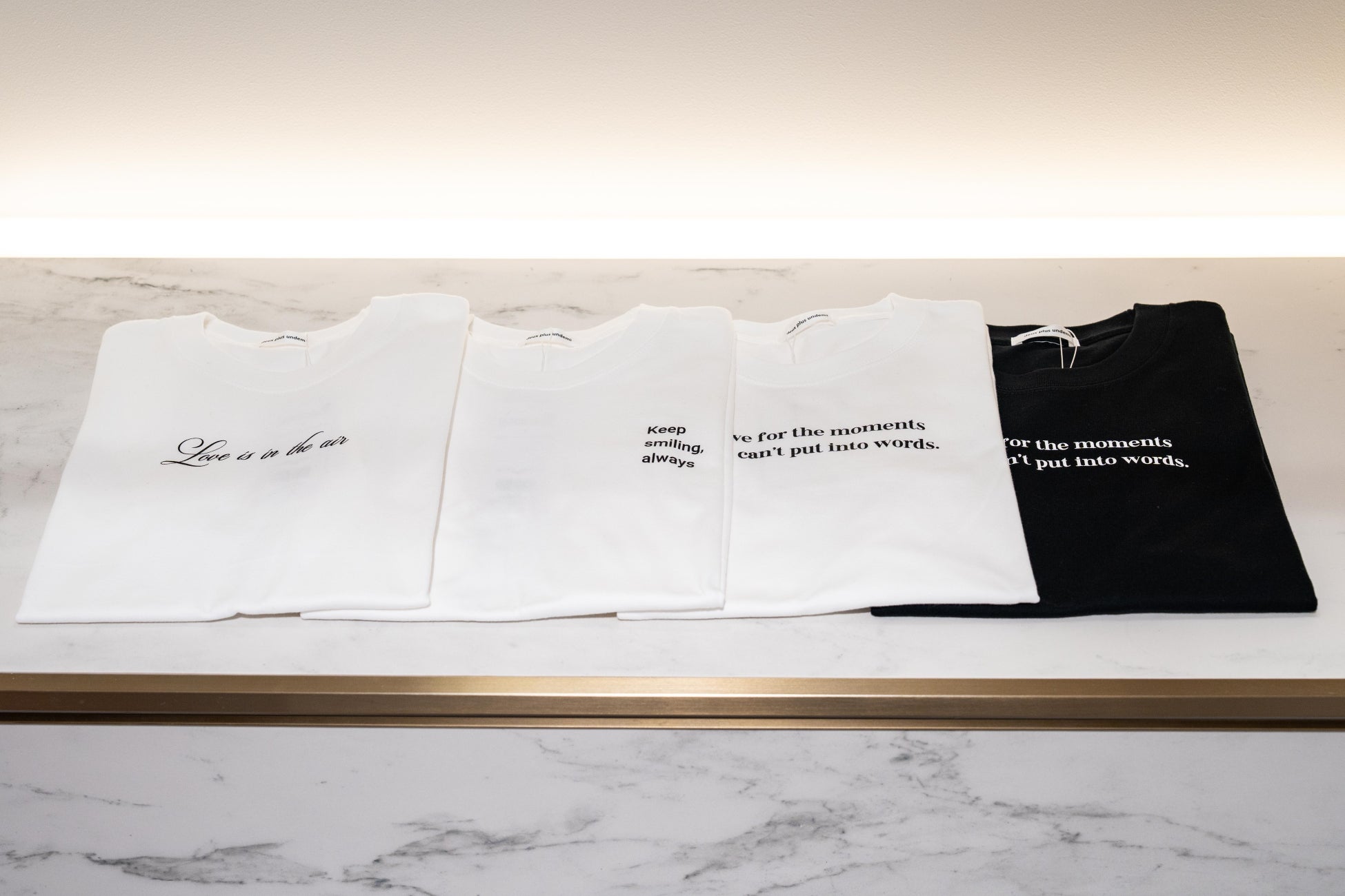 オープンを記念して、知的な愛らしさと、モダンな感性を込めたスタイルを提案する「1/2 un-demi (アンドゥミ)」の別注カットソーを販売します。これからの季節に使いやすく、スタイリングのアクセントになるメッセージカットソーを「エポカ ザ ショップ丸の内」限定でデザインしました。