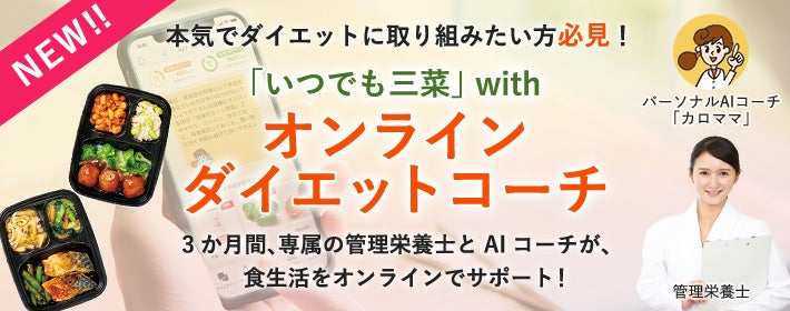 ワタミ株式会社(東京都大田区、以下ワタミ)が 2017年より販売を行っている冷凍惣菜宅配サービス「ワタミの宅食ダイレクト」は、株式会社リンクアンドコミュニケーション(東京都千代田区、以下リンクアンドコミュニケーション)が提供するAI健康アプリ「カロママ プラス」と3種のお惣菜「いつでも三菜」を組み合わせた3か月のダイエットサポートプラン「いつでも三菜withオンラインダイエットコーチ」の提供を開始。