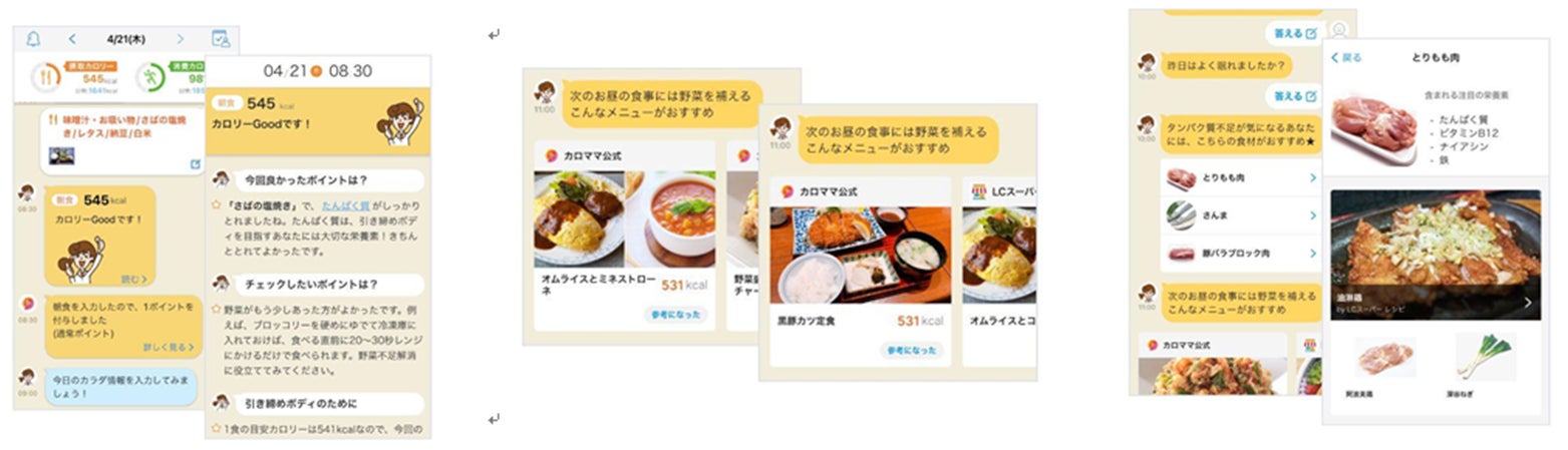毎日の食事や運動、睡眠などのライフログに、パーソナルAIコーチ「カロママ」がリアルタイムにアドバイスをする健康管理アプリです。独自のアルゴリズム・AIにより、食事画像を認識してカロリー計算、栄養バランスの評価を行います。その後、食事の改善点や次の食事の提案を2億通り以上のアドバイスの中から自動で提供します。また、スマホ内蔵の歩数計やウェアラブルデバイスともデータ連携し、運動量も自動的に取得します。