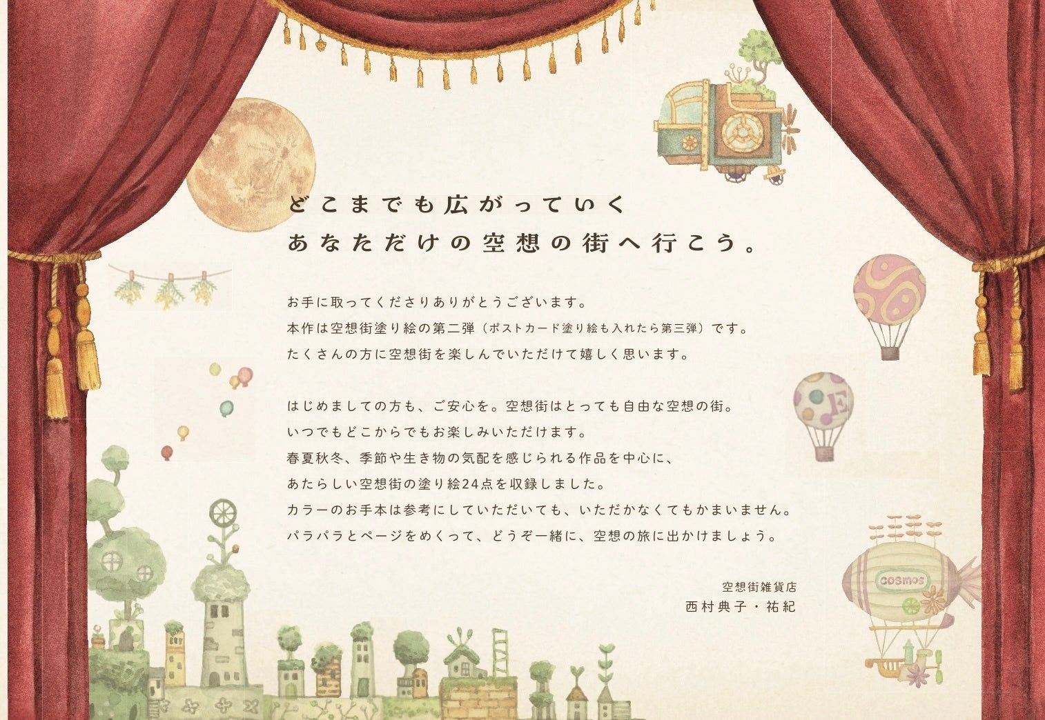 空想街ならではの色づかい、彩色テクニックも多数紹介し、作品ギャラリーとしても楽しめる一冊。空想街ファンも、大人の塗り絵ファンも、はじめての方も、ぜひ最新刊『空想街雑貨店の季節をめぐる旅する塗り絵』にご注目ください!