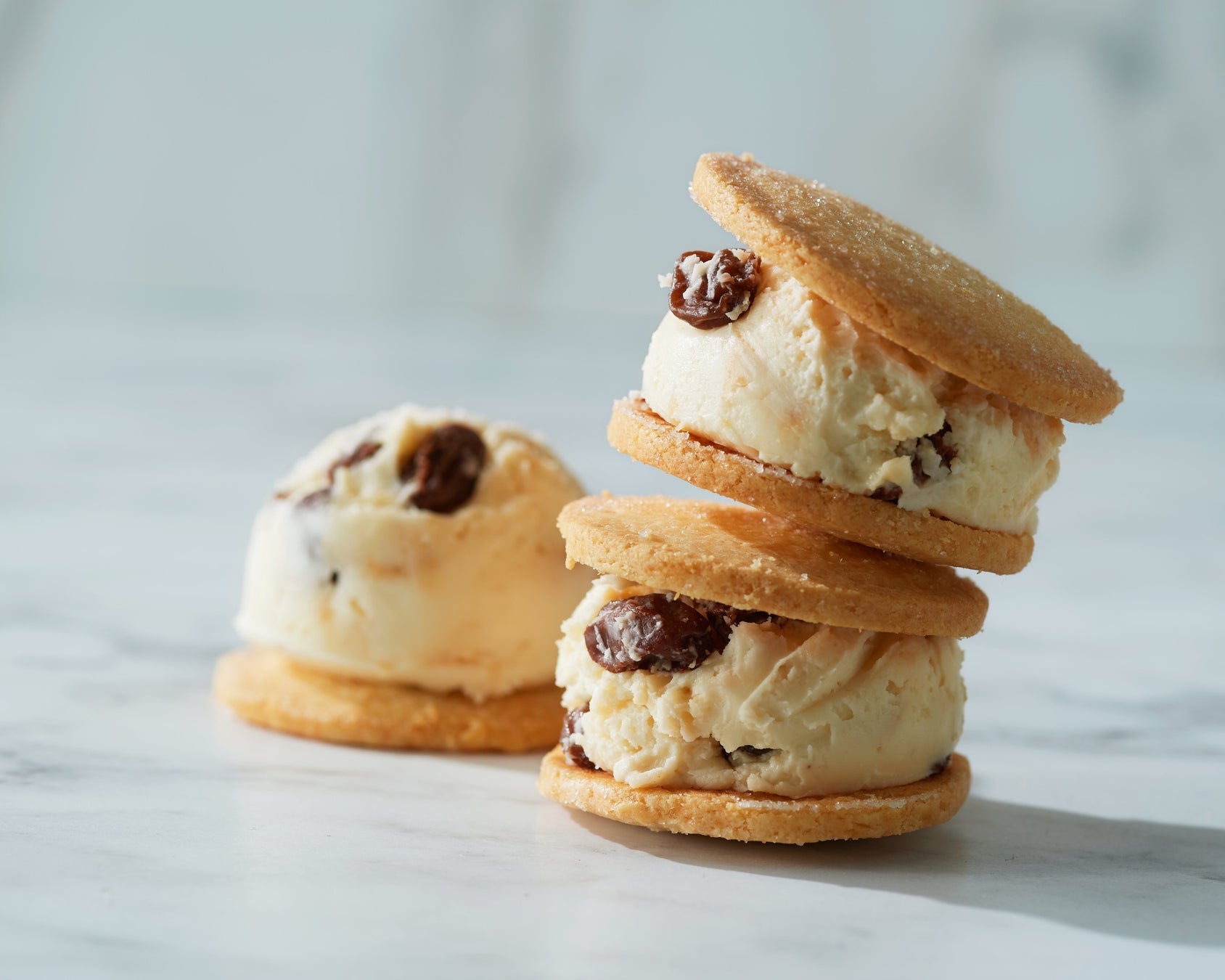 レアチーズサンドの醍醐味を存分に味わえる逸品。北海道産のクリームチーズとイタリア産のマスカルポーネを使用したチーズクリームにレーズンとカシューナッツをトッピングしました。オリジナルのチーズとのバランスは絶妙。お口の中がチーズでいっぱいになります。