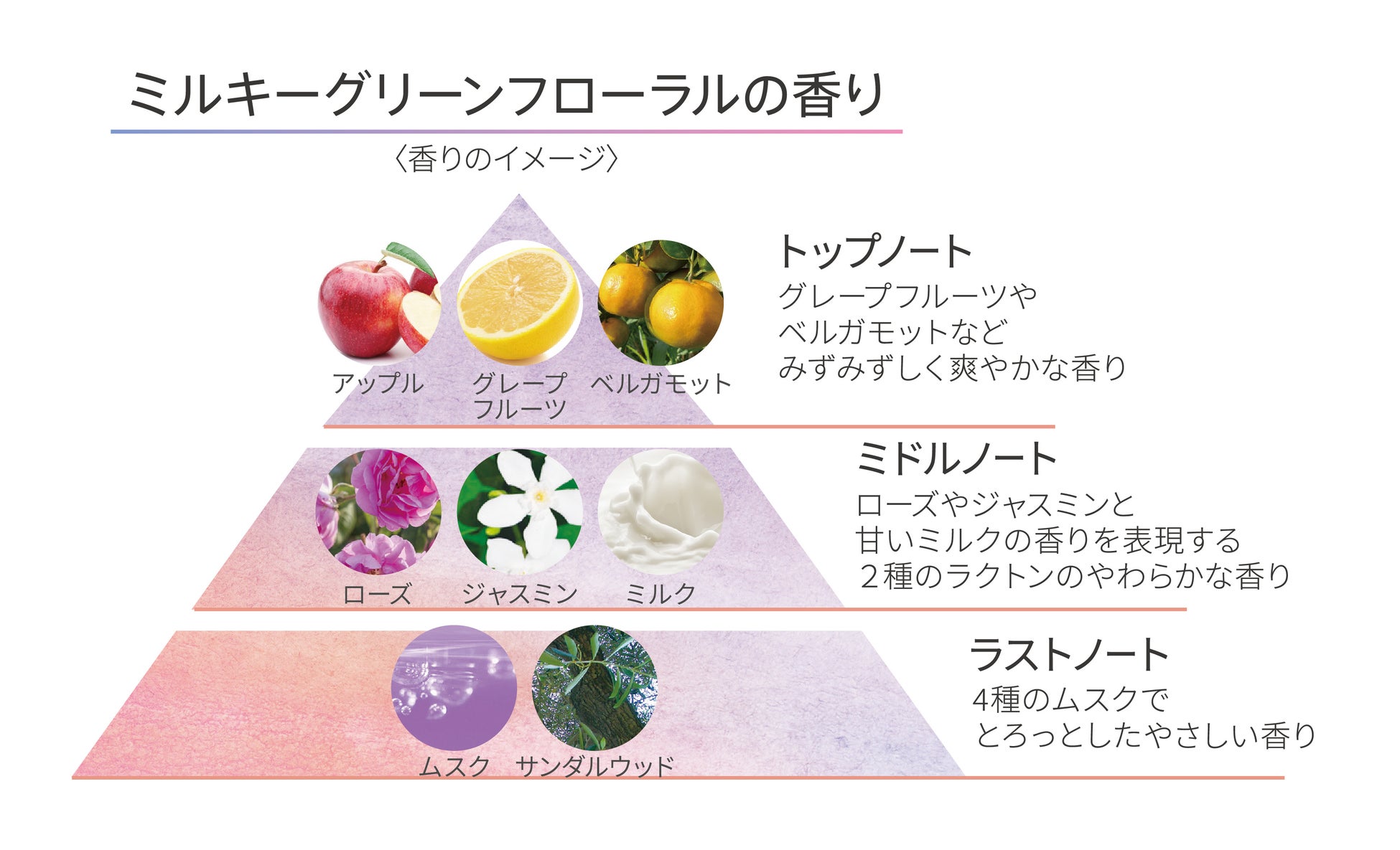 みずみずしくさわやかでありながら、ミルキーな甘さを潜めたミルキーグリーンフローラルの香り。