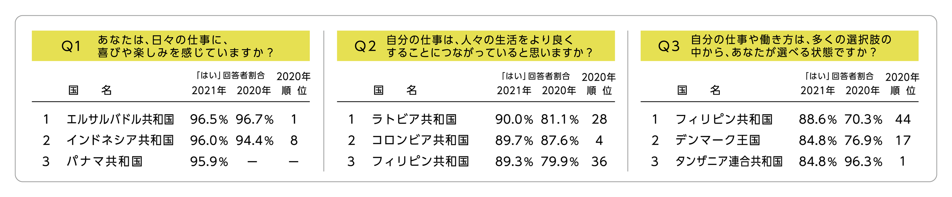 ・日本の「はい」回答者割合は3項目すべてで低下、世界ランキングもダウン