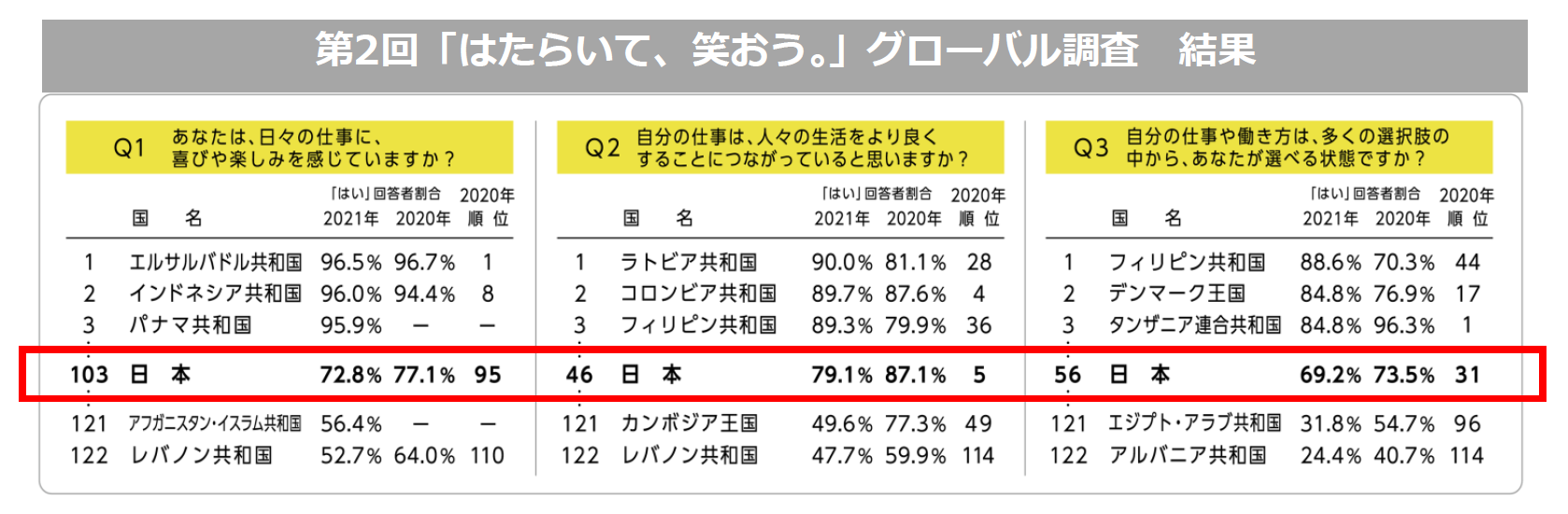 ・2021年調査では、日本はQ1-3のいずれでも「はい」と回答した人の割合は低下し、世界ランキングでも順位がダウン。