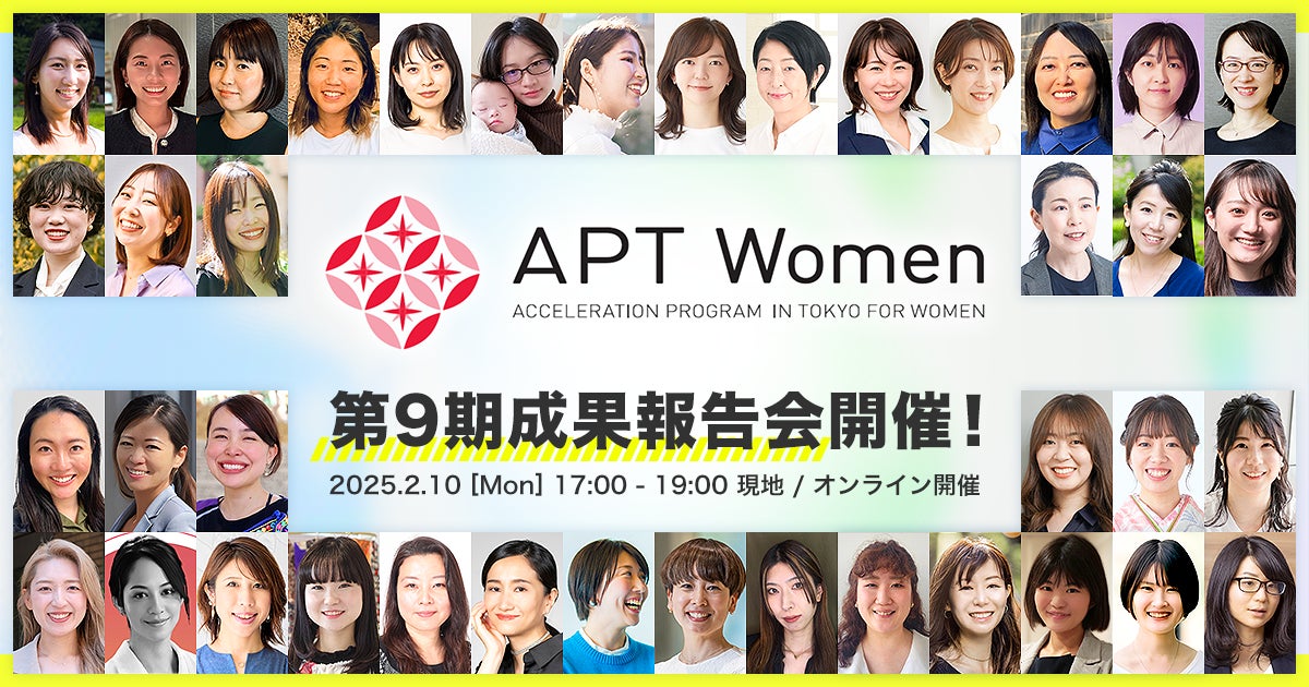 東京都女性ベンチャー成長促進事業「APT Women(※)」は、2025年2月10日(月)に、第9期受講生の代表者がプログラムを経て得た成果を発表する、第9期成果報告会を開催します。さらに、2月19日(水)には、第9期受講生の選抜メンバーによるピッチイベントを実施します。