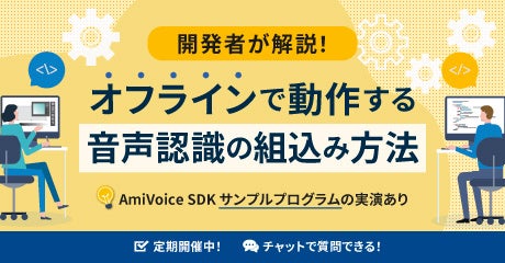 オフラインで使用できる音声認識エンジン「AmiVoice SDK」について開発者視点から特長はもちろん、データエントリーでの音声認識活用事例や、サンプルを使った具体的な音声認識の実行方法まで詳しくご紹介するオンラインセミナーを定期開催しております。