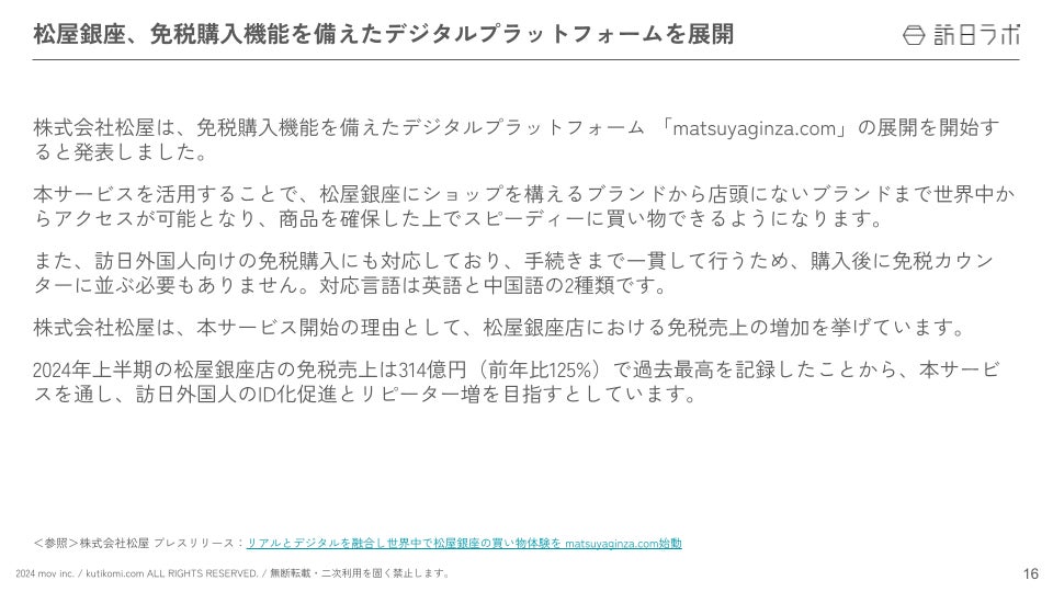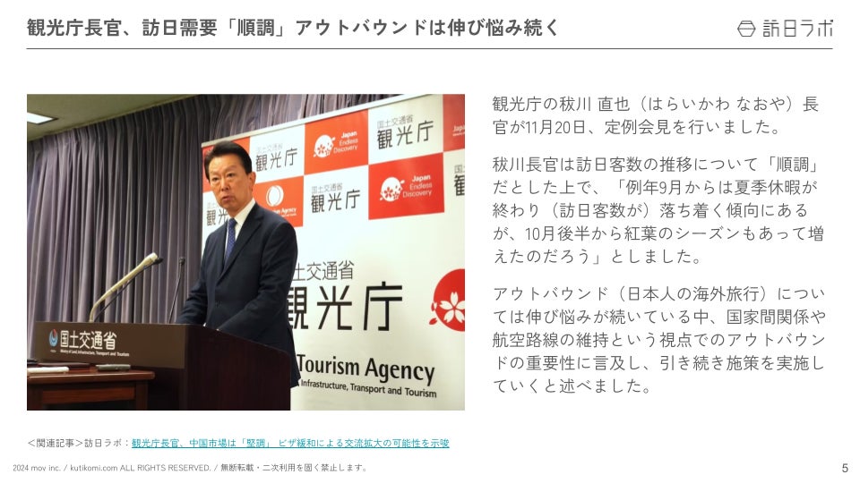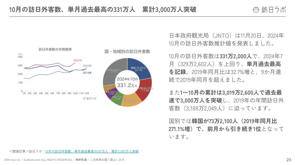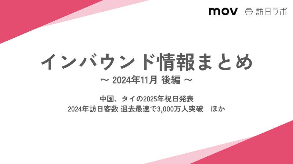 業界最大級のインバウンドビジネスメディア「訪日ラボ」及び 店舗向け集客一元化プラットフォーム「口コミコム」を運営する株式会社mov(代表取締役:渡邊 誠、本社:東京都渋谷区、以下mov)は、「インバウンドに関する最新トレンド・データ」「政府・自治体・企業などのインバウンド関連の取り組み」をはじめ、インバウンド対策に役立つニュースをまとめた「インバウンド情報まとめ【2024年11月前編】」を公開しました。